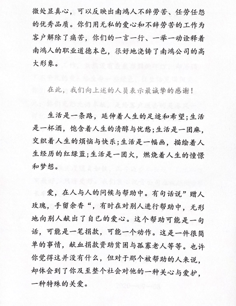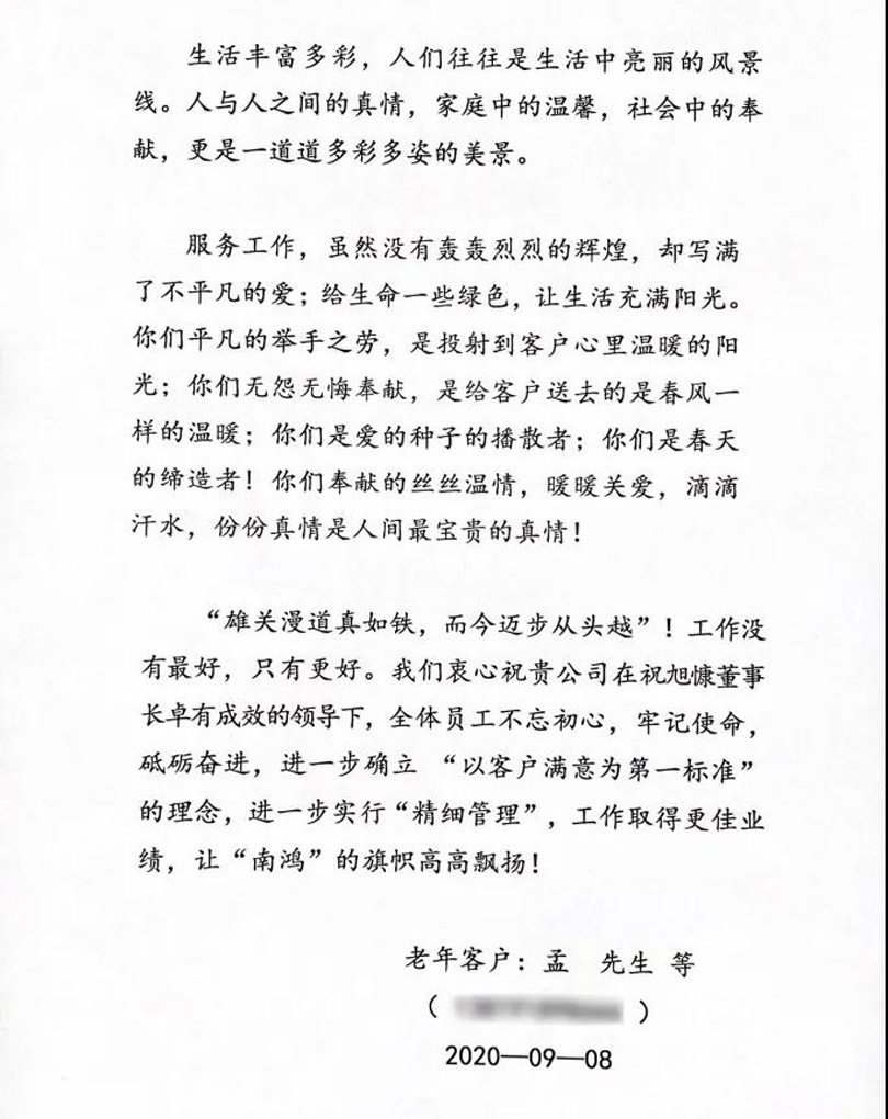 “你們用無私的愛心和不辭勞苦的工作為客戶解除了痛苦,你們的一言一行、一舉一動詮釋著南鴻人的職業(yè)道德本色,很好地澆筑了南鴻公司的高大形象?!?/p>